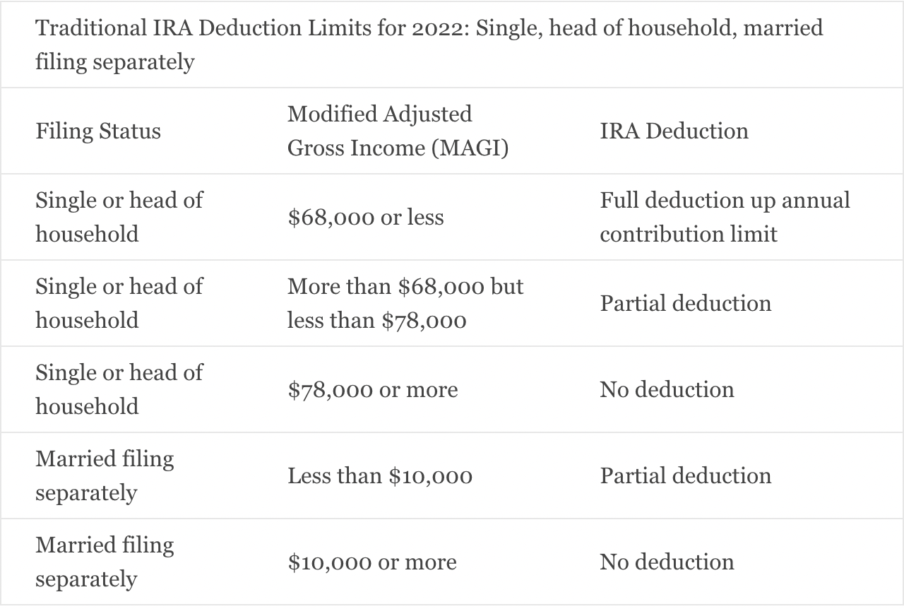 | Filing Status/Situation | Full Deduction Allowed | Partial Deduction Allowed | No Deduction Allowed |